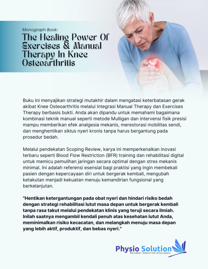 “Bebaskan diri dari keterbatasan gerak akibat Osteoarthritis lutut melalui sinergi Manual Therapy dan Exercises Therapy berbasis bukti. Buku ini menyajikan strategi rehabilitasi mutakhir—mulai dari teknik Mulligan hingga teknologi Blood Flow Restriction—untuk meredakan nyeri secara signifikan, merestorasi fungsi sendi, dan mengembalikan mobilitas aktif Anda tanpa bergantung pada intervensi bedah.“